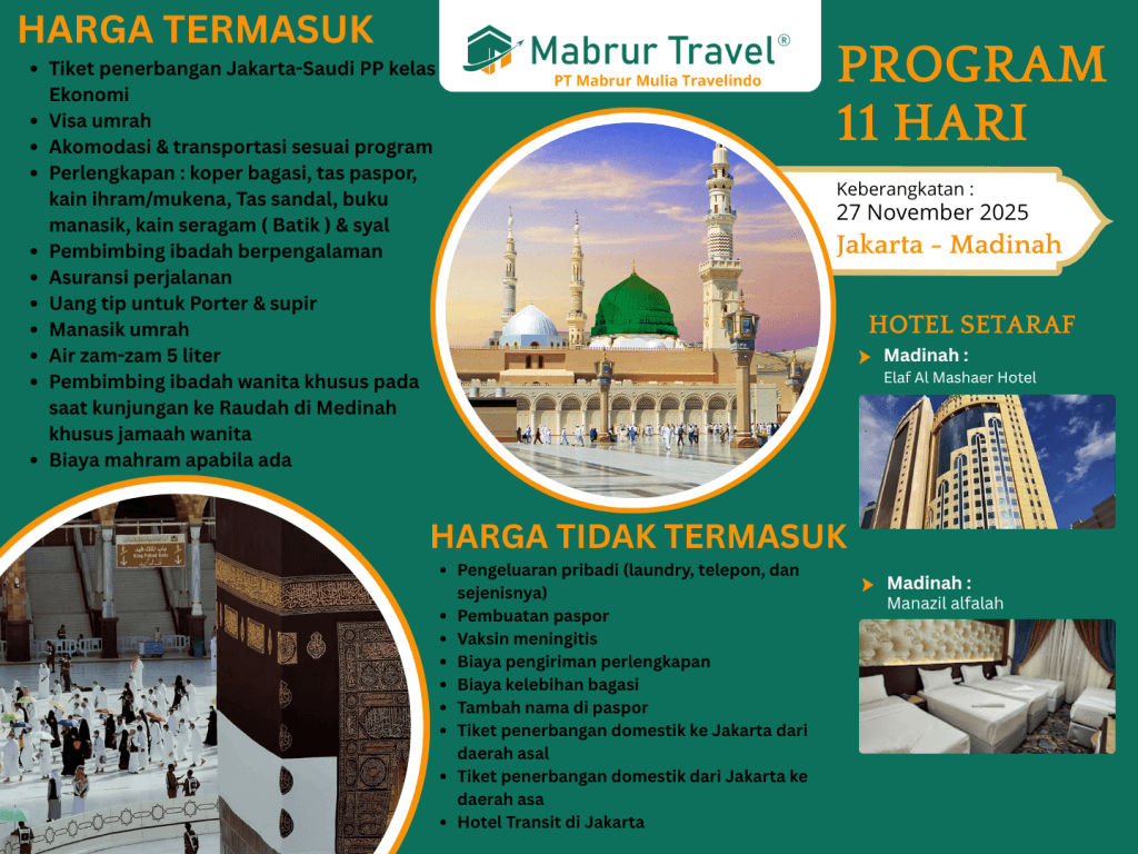 - Perlengkapan : koper bagasi, tas paspor, kain ihram/mukena, Tas sandal, buku manasik, kain seragam ( Batik ) & syal